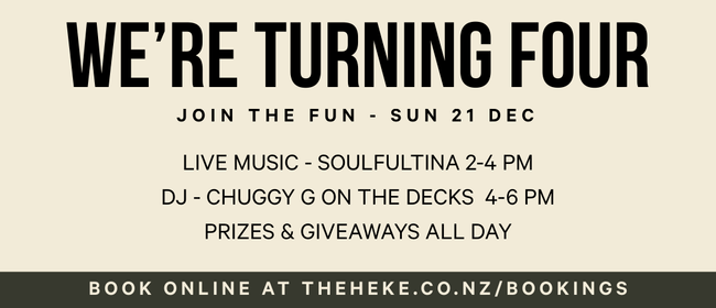 Join us to celebrate our fourth birthday! Soulfultina plays live from 2 pm DJ Chuggy G hits the decks after that from about 4- 6 pm Giveways and prizes all day Great food and drink that The Heke is known for. ...